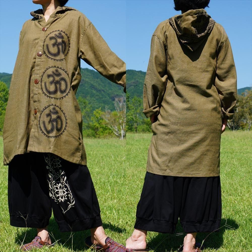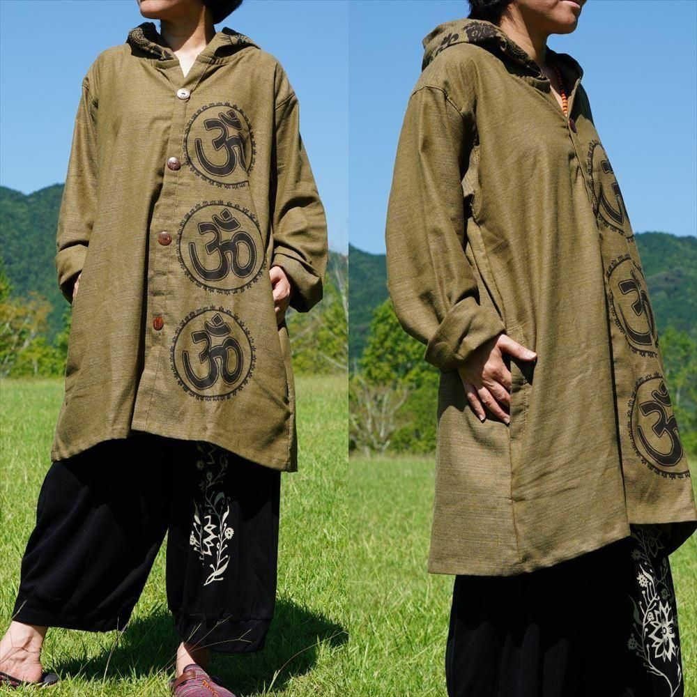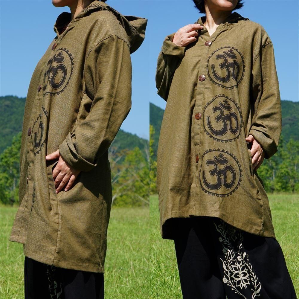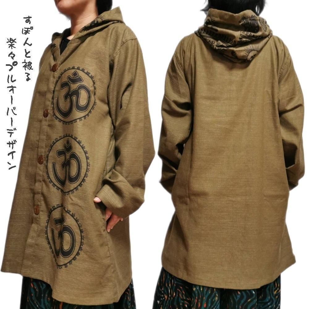 オーム(om)のデザインが目を惹く、ちょっぴり長め丈のコート風プルオーバー♪すぽっと被るタイプの楽ちんアウターです。フ―ドのラムナミデザインや、ココナッツの飾りボタンがさり気なくおしゃれを引立ててくれそう!両サイドにはあると便利なポケット付き。ゆったり着心地でユニセックス使いもおすすめです◎素材はALLコットン、季節の変わり目などロングシーズンお楽しみ頂けます。