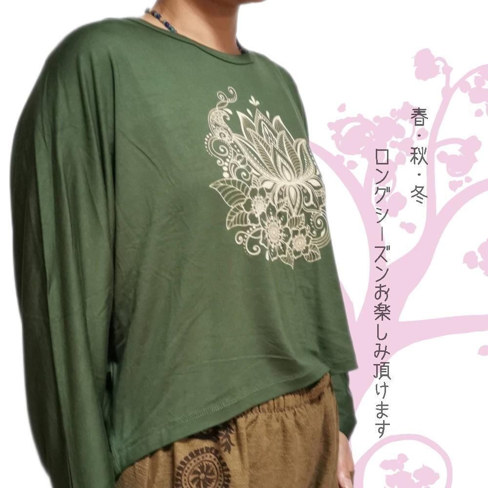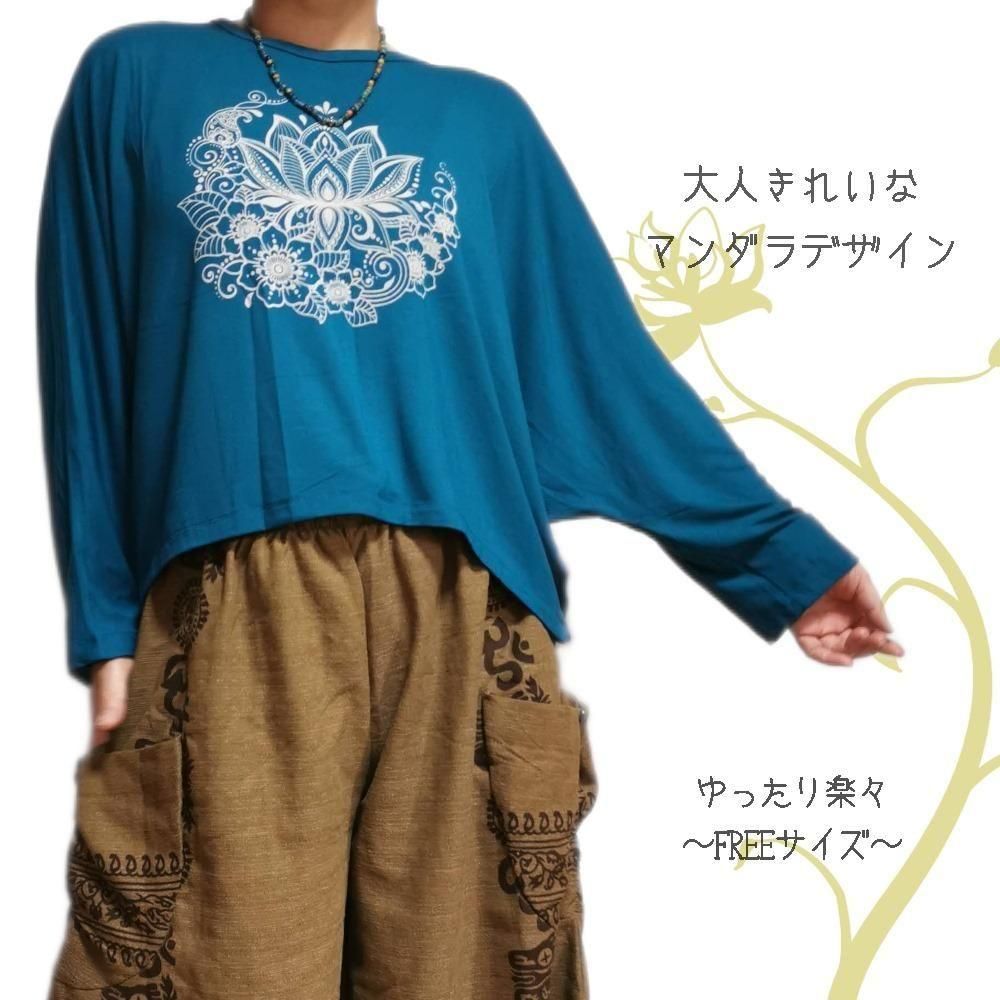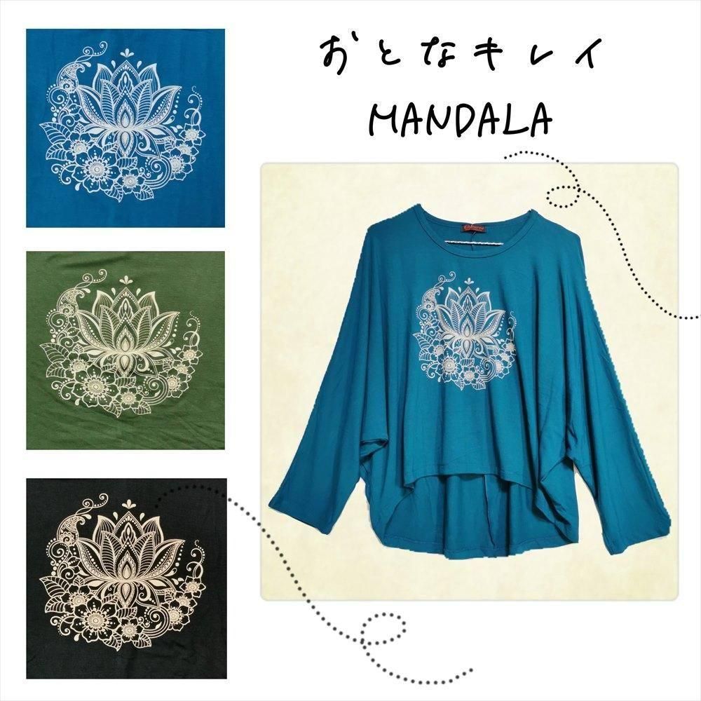 大人きれいなマンダラデザインが素敵な、ゆったり着心地のドルマントップス♪一度着たらクセになるストレッチ抜群の滑らかレーヨン素材、オールシーズン楽しめるアイテムです◎フロント部分を少し短めにデザインしているので、ボトムスコーデををすっきり見せてくれそうです。幅広いサイズの方に楽しんで頂けるゆったりとしたドルマンシルエット、冷える時期はレイヤーコーデでお楽しみ下さい。
