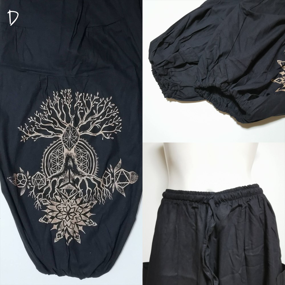 Tree of life(生命の樹)の神秘的なデザインが素敵な、ゆったりアラジンパンツです♪リラックス気分満点のゆったりシルエット、ウエストはゴム&リボンのW仕立てでサイズ感の調節も可能です。サイドには大きめポケットも付いているので、ちょっとしたお出かけにも便利です。コットン素材なのでロングシーズンお楽しみ頂けます。